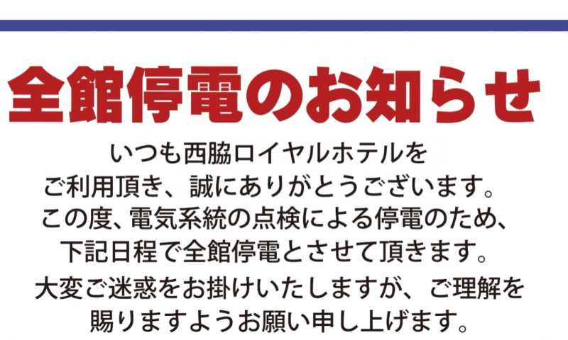 館内停電のお知らせいつも西脇ロイヤルホテルをご利用いただき、誠にありがとうございます。この度、電気系統の点検による停...