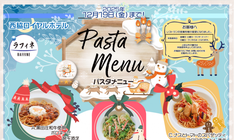 2025.10.31 レストラン レストランからのお知らせ(10/31更新) レストランのお知らせをこちらのページで掲載いたします。◆パスタメニュー一新しました!◆レストラン一部営業時間変更・店休...